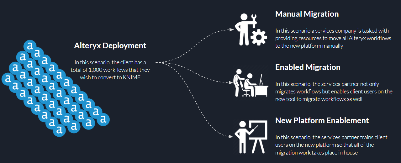 Let’s consider a Alteryx migration scenario where a potential client is looking to move all their current Alteryx workflows to the new platform. There are generally 3 different ways that a migration would occur.